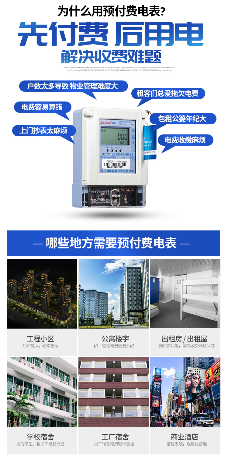 (4)預付費電度表適用的場所:工程小區(qū)用戶-龐大輕松管理,公寓樓宇-統(tǒng)一管理收費系統(tǒng),出租房或出租屋-預付費功能解決收費麻煩問題,學校宿舍-方便學生教職工收費充值,工廠宿舍-員工宿舍電費管理,商業(yè)酒店-搭建系統(tǒng)規(guī)模化管理等具體如下。