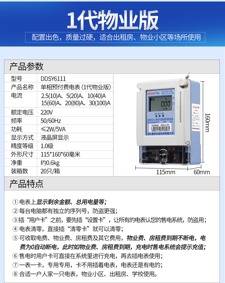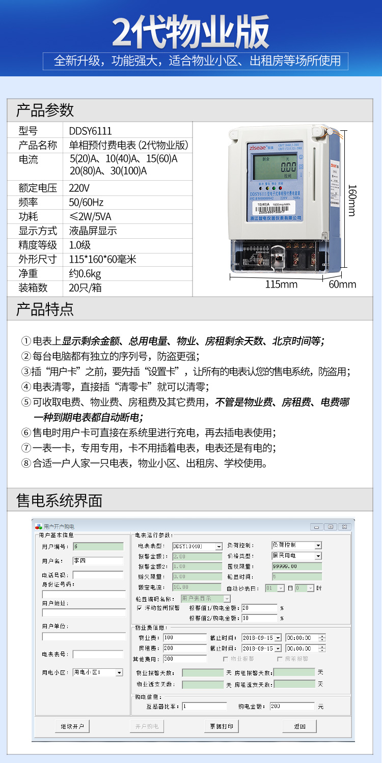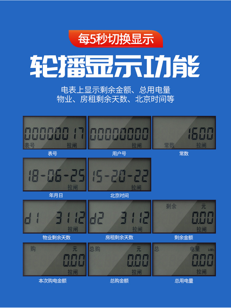 (2)預付費電表的功能:經典款電表是上顯示剩余電量、總用電量等,1代物業(yè)版電表上顯示剩余于金額、總用電量等,2代物業(yè)版電表上顯示剩余金額、總用電量、物業(yè)、房租剩余天數(shù)、北京時間等具體功能如下。
