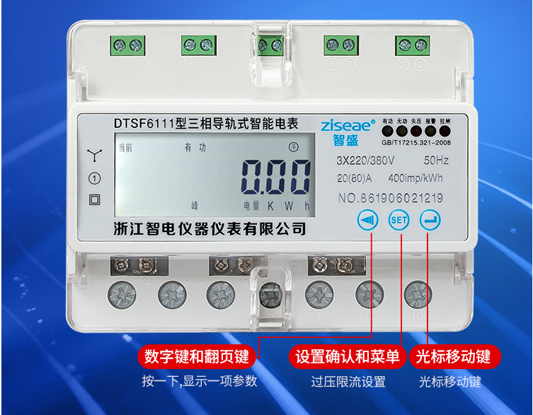 三相導軌式多費率電能表DTSF6111-7系我公司采用微電子技術計量電能,采用進口集成電路,應用數字采樣處理技術及SMT工藝等先進技術研制開發的電子式電能表。能直測量電能計量中正向有功電能,7位LCD顯示器顯示有功用電量,具有可靠性好、體積小、重量輕、外表美觀、工藝先進、35mmDIN標準導軌式安裝等特點:并具有良好的抗電磁干擾、低自耗節電、精度高、高過載、穩定性強、防竊電、壽命長,液晶屏幕上可顯示當前總電量,無功電量,尖峰平谷的電量,電流,電壓,功率,功率因素,頻率,支持RS485 DL/645--2007或MODBUS通訊規約。