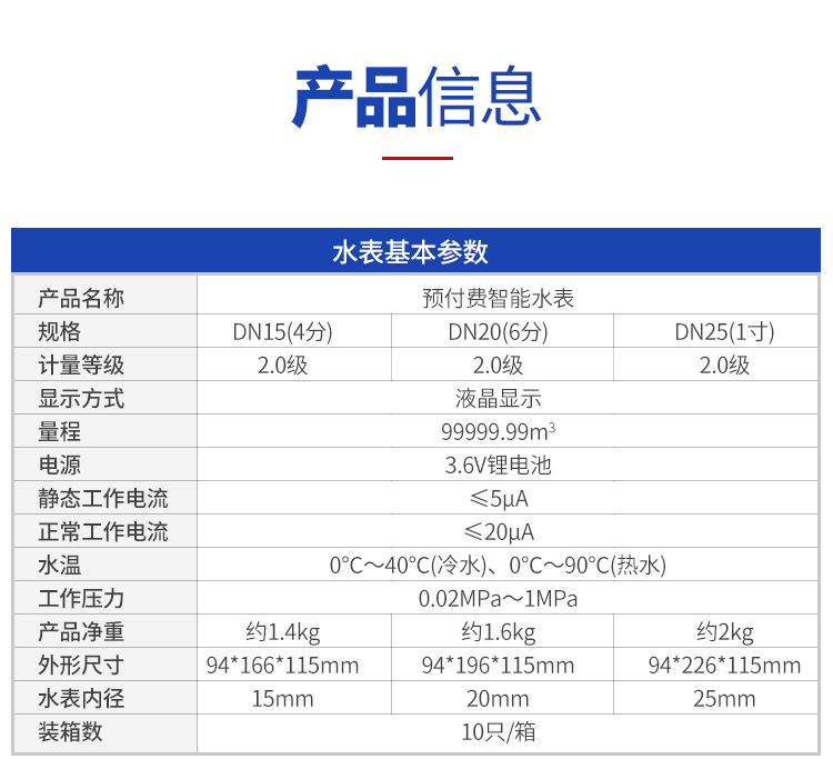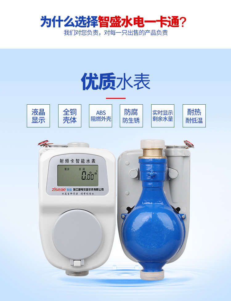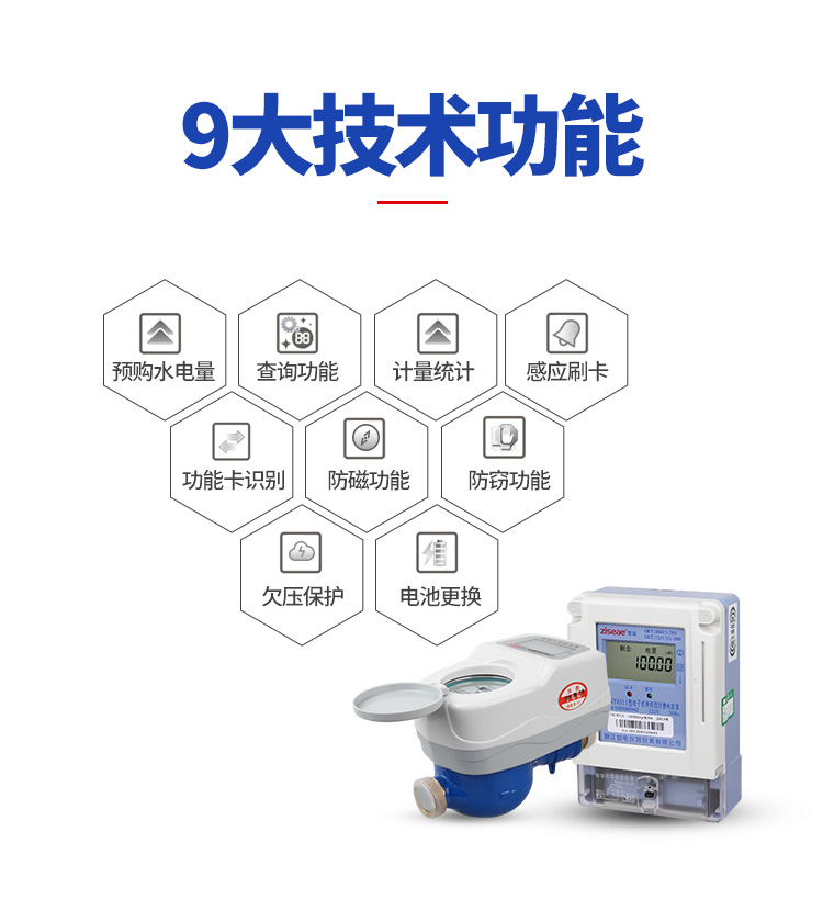 1、概述預(yù)付費(fèi)水表是以旋翼式水表為基表,由干簧管取信裝置、低功耗電控閥門、微電腦控制系統(tǒng)、射頻卡信息系統(tǒng)集合而成的智能水表。該產(chǎn)品改變了傳統(tǒng)的用水收費(fèi)方 式,由“先用水后交費(fèi)”變?yōu)椤跋冉毁M(fèi)后用水”, 每次售水收款都有記錄,解決了“收費(fèi)難、賬目亂”這兩個(gè)水費(fèi)管理工作中的難題。有遠(yuǎn)傳抄表功能的預(yù) 付費(fèi)水表還可實(shí)時(shí)統(tǒng)計(jì)用水?dāng)?shù)量,為水費(fèi)結(jié)算提供依據(jù)。產(chǎn)品符合國家標(biāo)準(zhǔn)GB/T778-2007《封閉滿管道中水流量的測量、飲用冷水水表和熱水水表》的全部技術(shù)要求。